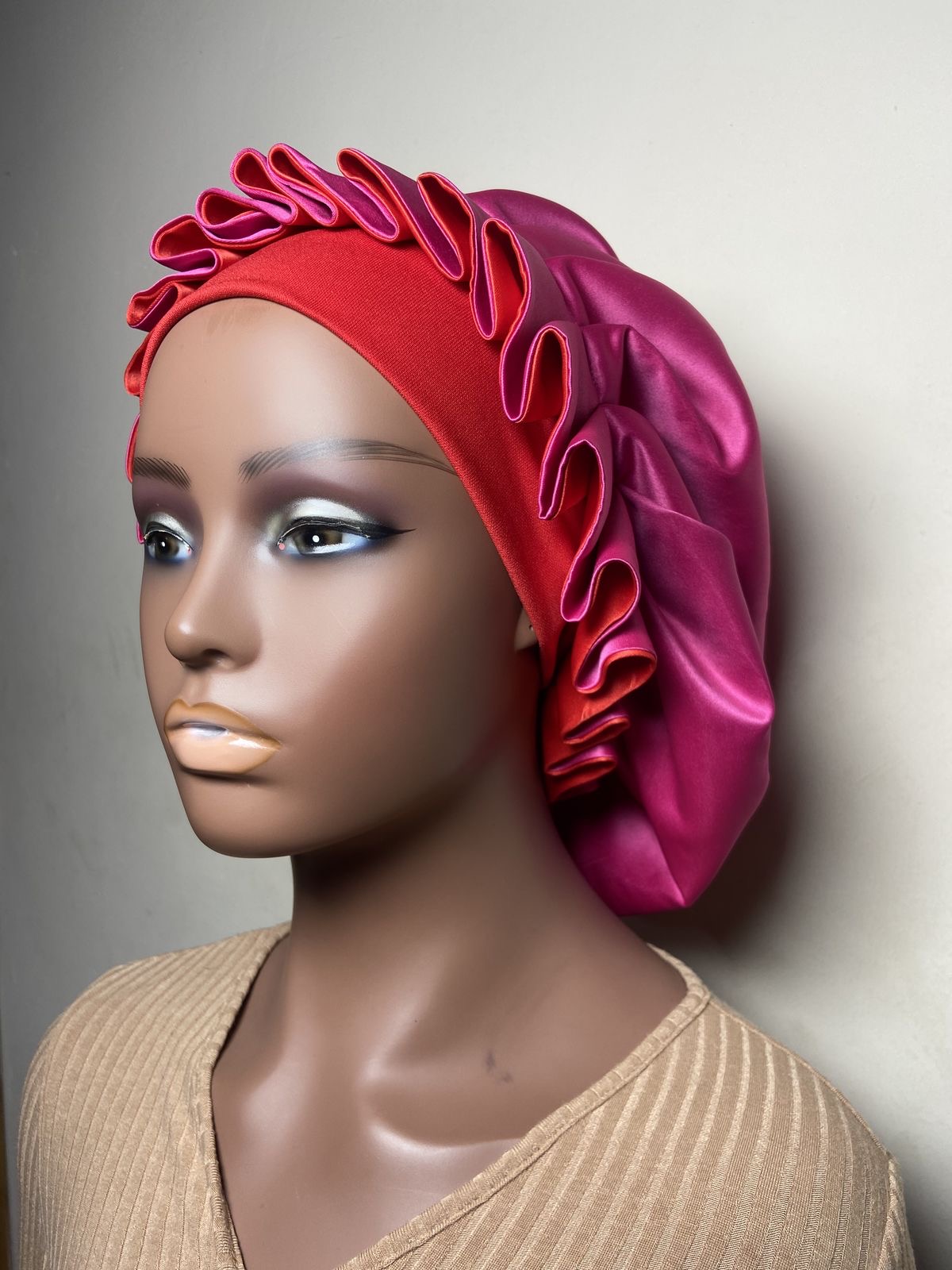 The bonnet cap is a beautifully crafted head covering designed with both style and hair protection in mind. It features a smooth, lustrous satin material in a rich, vibrant pink that forms the main body of the bonnet, giving it a luxurious sheen and a soft, flowing appearance. Around the front, it has a bold red band that fits snugly around the hairline, creating a secure and comfortable hold.