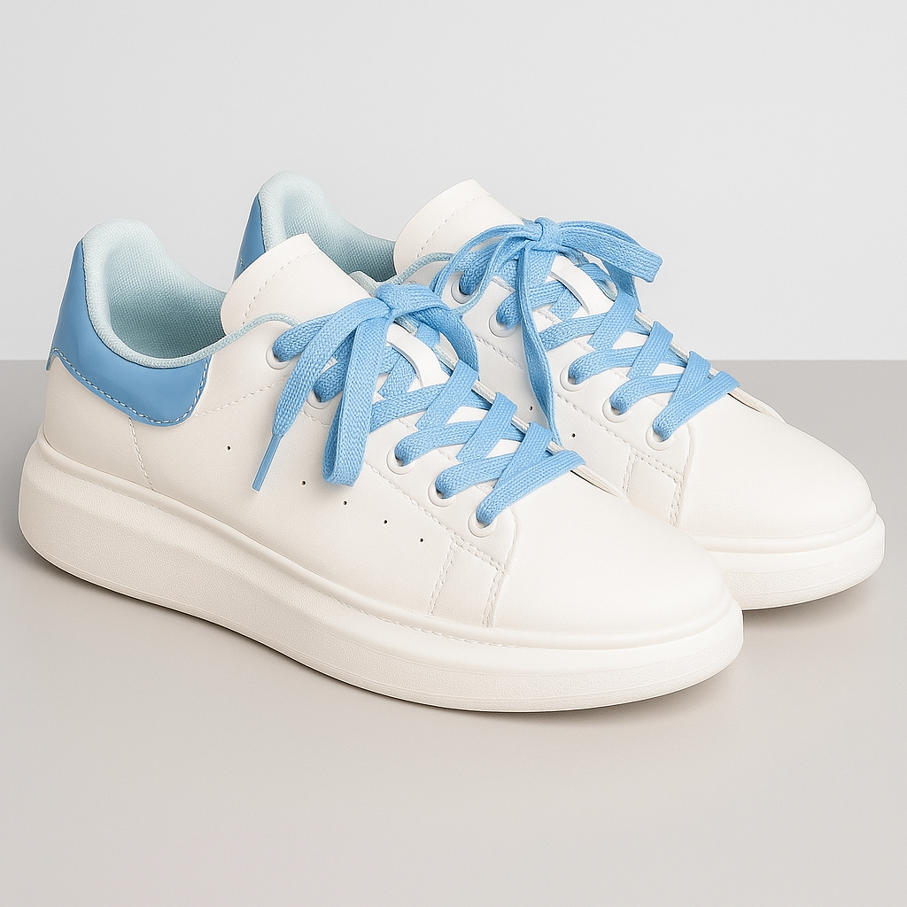 Crafted from premium faux leather with breathable inner padding, these sneakers feature a sleek white body contrasted with sky-blue laces and heel panels, giving them a refreshing, youthful edge.