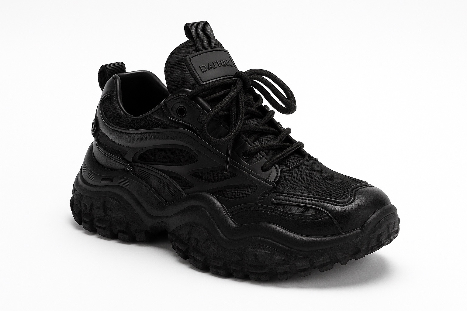 The DAPHNE Chunky Sneakers are a statement of confidence and durability. Featuring an all-black design with a mix of textile mesh, synthetic leather overlays, and a chunky trail-style sole, these sneakers merge comfort with attitude.