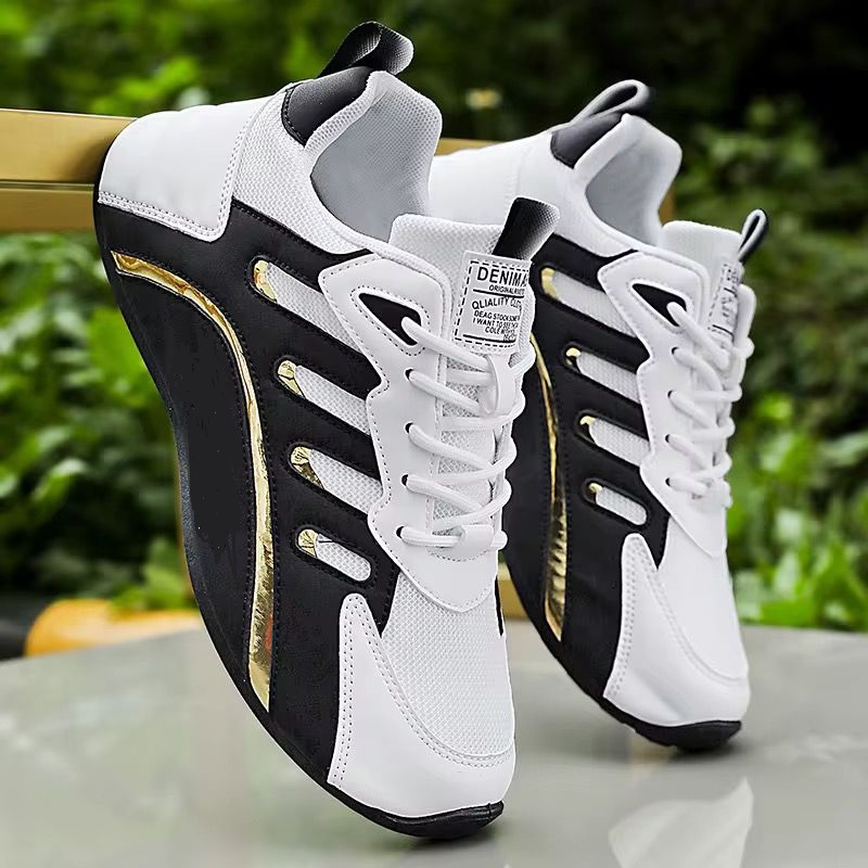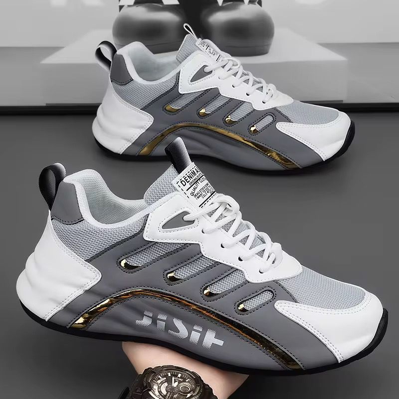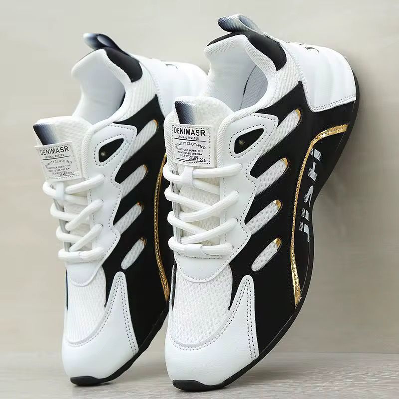 These stylish sneakers feature a breathable mesh upper that keeps your feet cool, paired with durable faux leather overlays for structure and support. The sleek design is highlighted with metallic gold accents and bold side branding for a trendy, urban appeal.