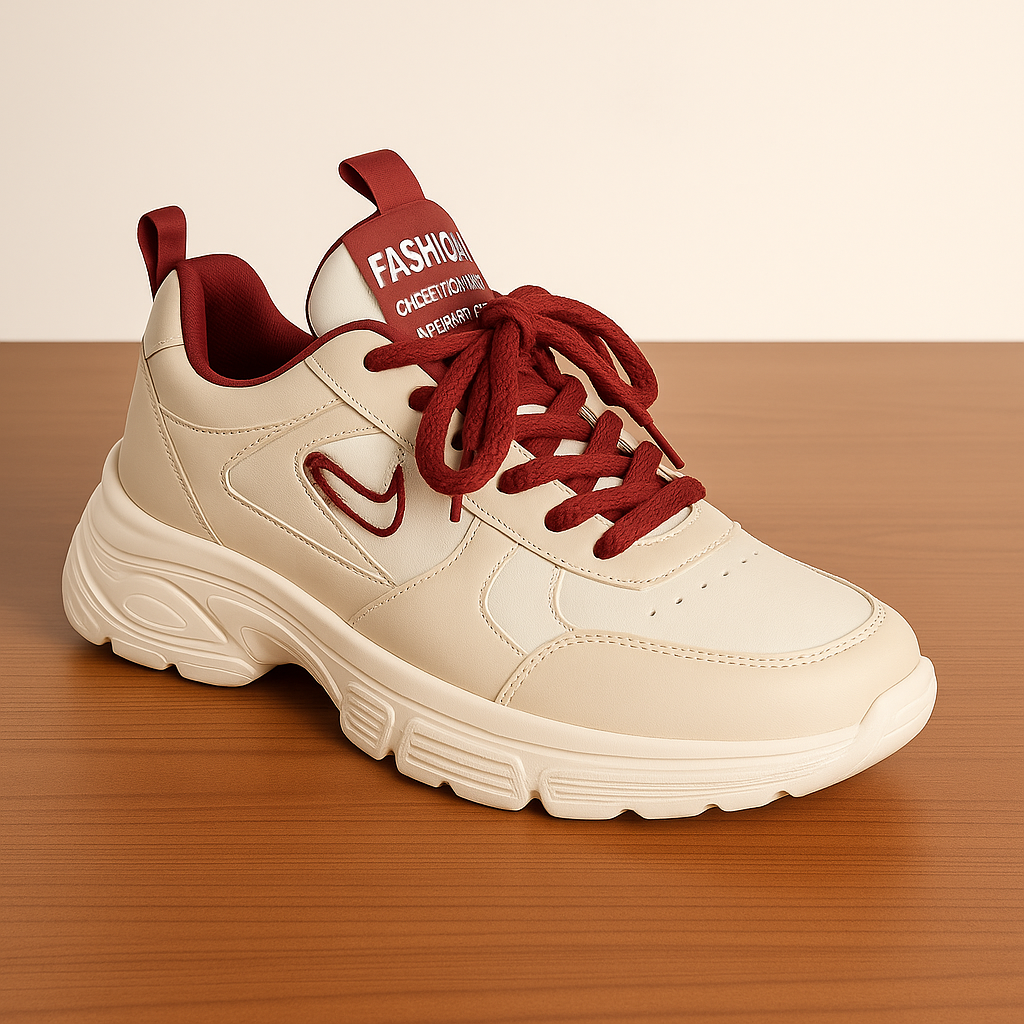 The sneakers feature a two-tone body in soft off-white and light cream panels, highlighted by rich wine-red laces and inner lining that add a touch of confidence and vibrancy. Its chunky sole offers great cushioning, giving you all-day comfort for errands, casual hangouts, or light workouts.