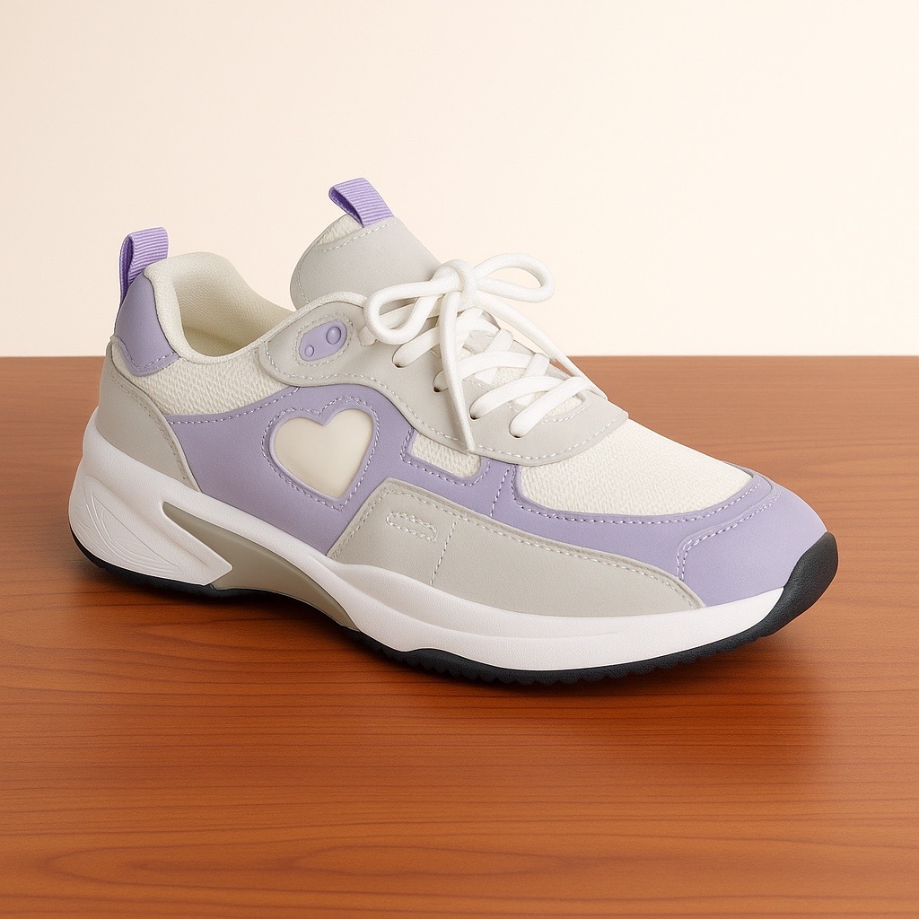 Featuring a beautifully balanced mix of lilac, cream, and off-white panels, this sneaker stands out with its cute heart-shaped side detail — symbolizing comfort, confidence, and effortless style. The breathable mesh upper ensures coolness all day, while the cushioned sole provides extra comfort and durability for long walks or active days.